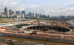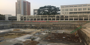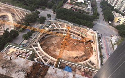 該工程位于華強(qiáng)北西南角原中航城產(chǎn)業(yè)園區(qū),分D1、O、GM、H四個(gè)地塊,總占地面積12萬(wàn)平方米,基坑四周建筑環(huán)境復(fù)雜、地下管線眾多,緊鄰地鐵1、2號(hào)線,基坑開挖深度為18—20米。我集團(tuán)根據(jù)不同地塊的實(shí)際條件采用了樁撐、樁錨及咬合樁等支護(hù)結(jié)構(gòu),樁間旋噴樁止水帷幕。工程樁采用人工挖孔樁基礎(chǔ),樁徑1.2—2.4米,樁端持力層為微風(fēng)化花崗巖。