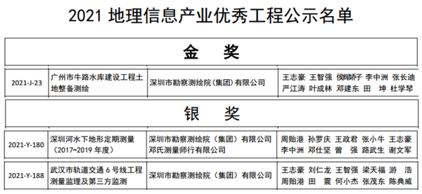 中國地理信息產(chǎn)業(yè)協(xié)會于2021年6月23日公布了2021地理信息產(chǎn)業(yè)優(yōu)秀工程獎獲獎名單。深勘集團喜獲金獎一項、銀獎兩項,其中“廣州市牛路水庫建設(shè)工程土地整備測繪”項目獲優(yōu)秀工程金獎,“深圳河水下地形定期測量(2017-2019年度)”、“武漢市軌道交通6號線工程測量監(jiān)理及第三方監(jiān)測”兩個項目獲優(yōu)秀工程銀獎。
