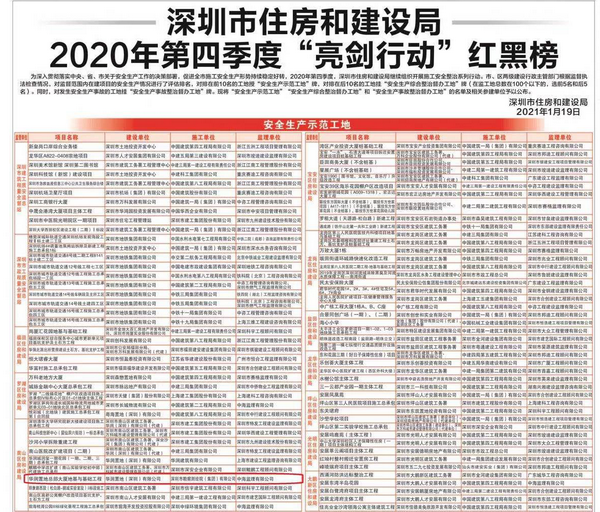 “深圳市‘亮劍行動’紅黑榜”是深圳市住房和建設(shè)局為深入貫徹落實中央、省、市關(guān)于安全生產(chǎn)工作的決策部署,深化和鞏固“百日亮劍行動”成效,促進(jìn)全市施工安全生產(chǎn)形勢持續(xù)穩(wěn)定好轉(zhuǎn)而繼續(xù)開展的施工安全整治系列行動。市、區(qū)兩級建設(shè)行政主管部門根據(jù)監(jiān)督執(zhí)法檢查情況,對監(jiān)督范圍內(nèi)在建項目的安全生產(chǎn)情況進(jìn)行了評估排名,對排在前10名的工地列入“紅榜”,授予“安全生產(chǎn)示范工地”牌,對排在后10名的工地列入“黑榜”,授予“安全生產(chǎn)綜合整治督辦工地”牌。