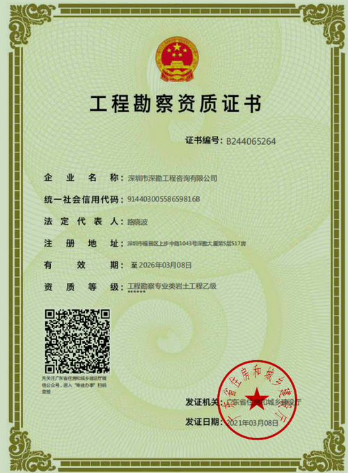 深勘集團全資子公司《深圳市深勘工程咨詢有限公司》于近日在原施工圖設(shè)計審查資質(zhì)(專業(yè):一類工程勘察)基礎(chǔ)上,新增工程勘察專業(yè)類巖土工程乙級資質(zhì)(涵蓋:巖土工程勘察、巖土工程設(shè)計、巖土工程物探測試檢測監(jiān)測等)。